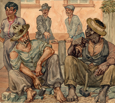 Operários de calçamento de ruas.  Aquarela. Dimensão 18 x 20cm